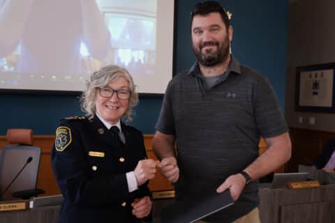 Frontenac County resident Mark Sherwin receives a Chief’s commendation from Frontenac Paramedics Chief Gale Cheval...