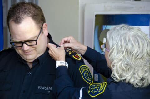 Frontenac Paramedics Chief Marc Goudie recieves his Chief’s eupaulettes from Chief Emerita Gale Chevalier, Sep 27....