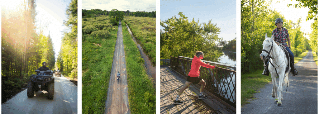 In Frontenac County, the K&P Trail is a fully developed stone dust rail-trail with stops in the communities of Sharbot Lake, Godfrey, Verona, and Harrowsmith along the way. The trail support year-round recreational activities such as cycling, walking, hiking, horseback riding, ATV use*, and snowmobiling. The trail intersects with the Tay-Havelock Trail in Central Frontenac and the Cataraqui Trail in South Frontenac, and together the three trails form the Trans Canada Trail route through Frontenac County.